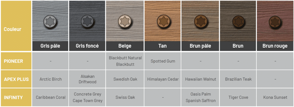Les têtes d’enfoncement sont colorées pour s’harmoniser avec votre terrasse et laisser une finition de surface soignée. Utilisez le tableau ci-dessous pour vous aider à choisir.